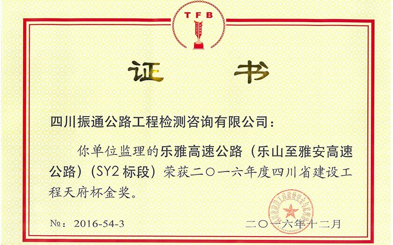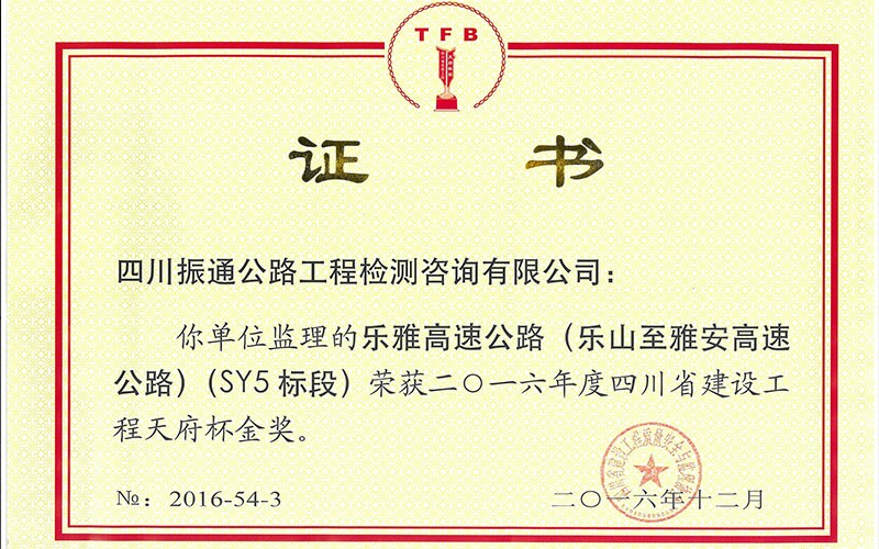 2013年9月乐雅高速全面建成通车,我们单位多次荣获“优秀监理试验室”称号,并荣获四川省建设工程天府杯金奖,这是公司的荣誉,也是我们的收获。